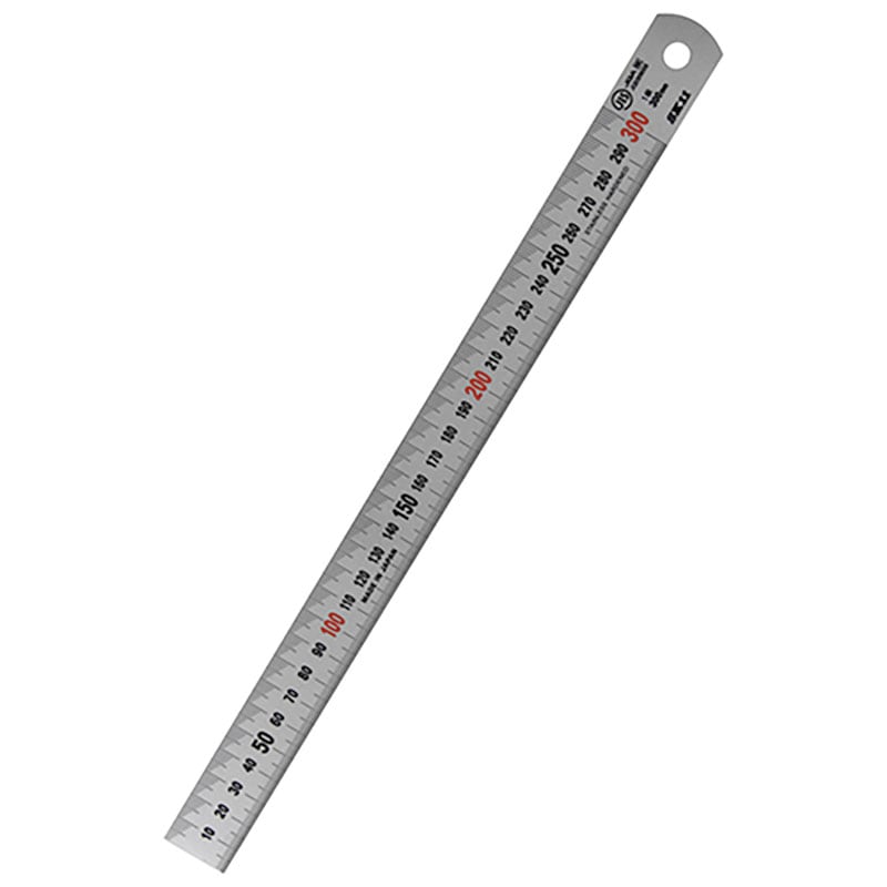 ●目盛ピッチ 上下段1mmピッチ ●裏面度量衡換算表付 ●本体サイズ 335×25×1.0mm ●製品質量 65g.....