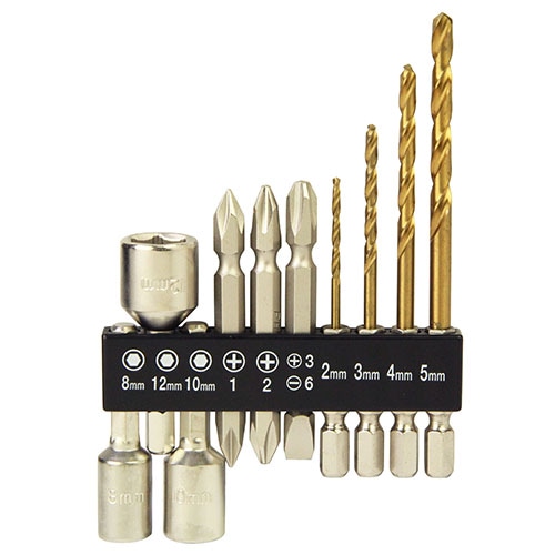 ねじ回し、ボルト回し、穴あけが出来るビットセットです。ビット3本、ソケットビット3本、鉄工ドリル4本、ホルダー付き。.....