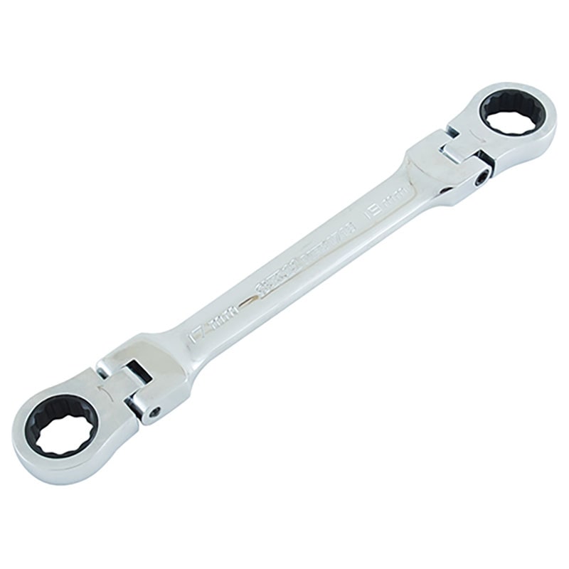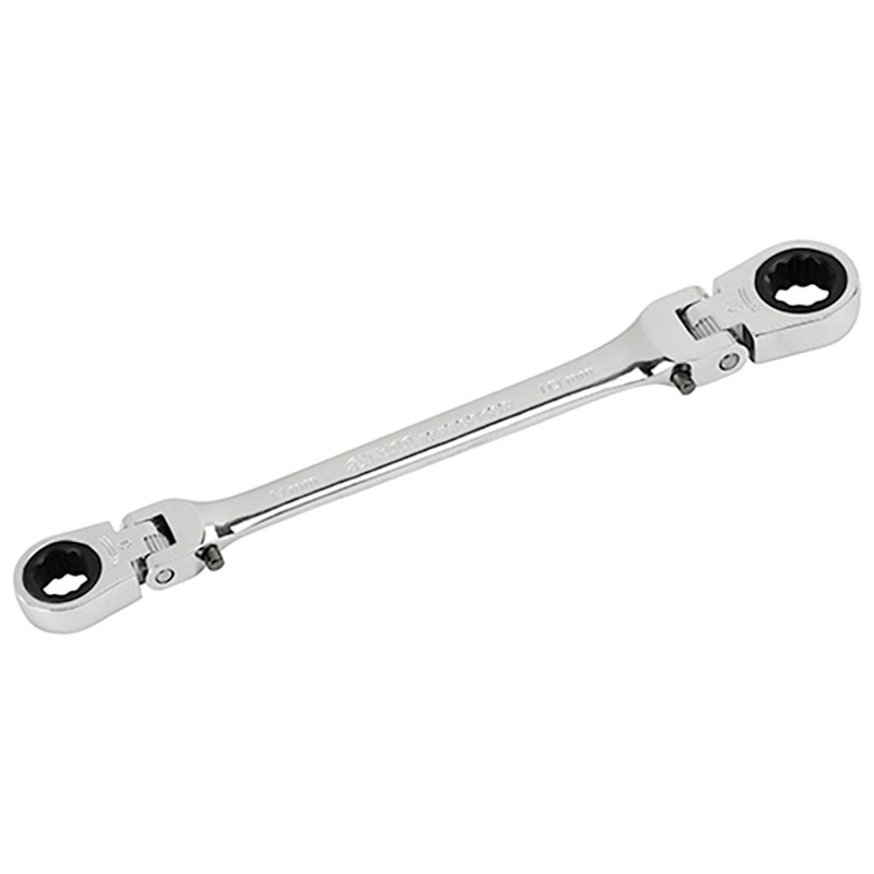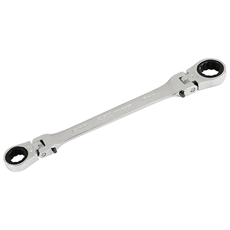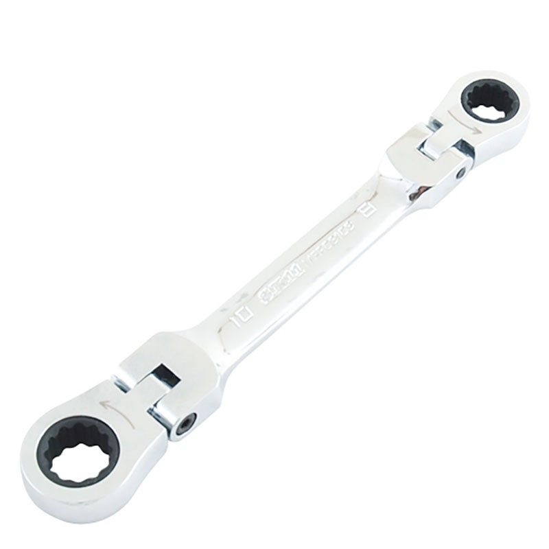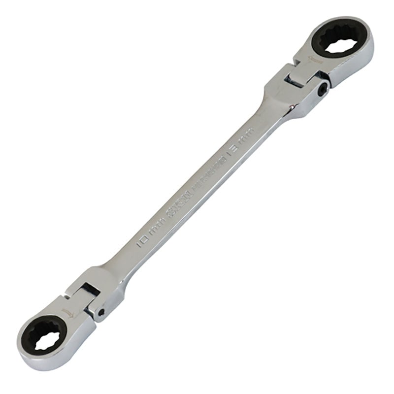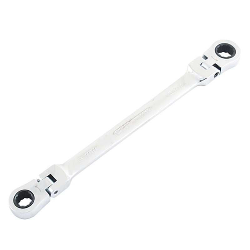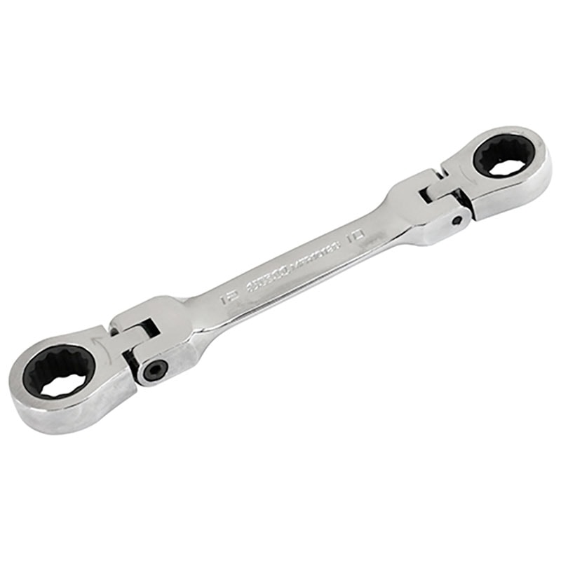 両側にラチェット機構のついためがね部を設け、1丁で2サイズに対応できます。両ヘッドともに任意の角度調整が可能なため、奥ま.....